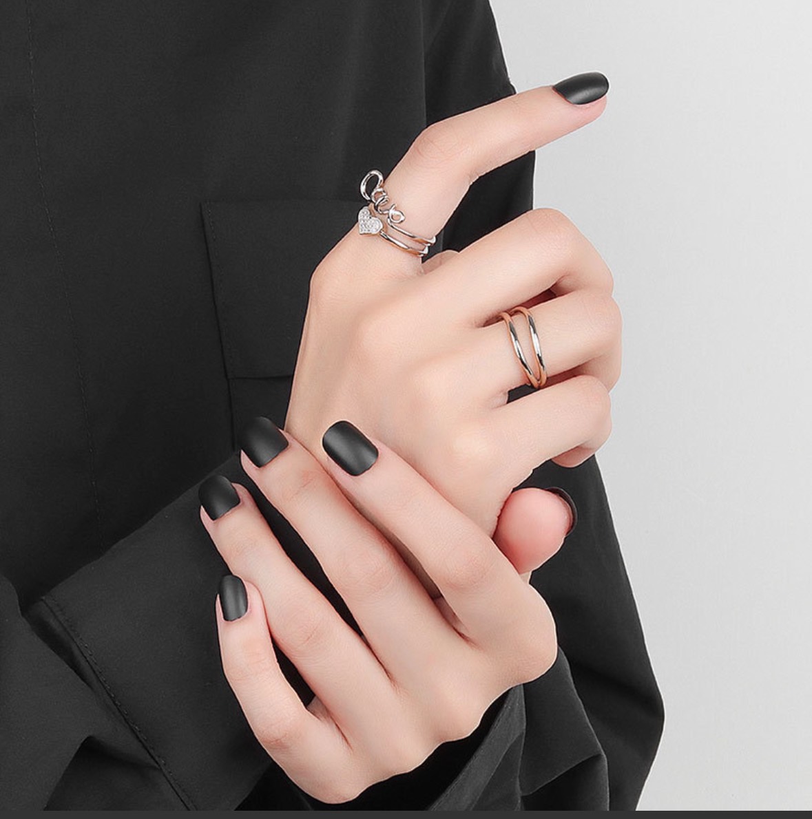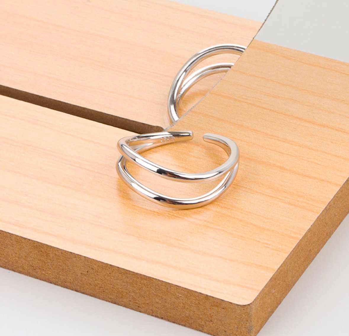 造型簡約,由兩條細長的銀色線條環繞而成,呈現雙環的設計。戒指線條流暢,表面光滑,整體質感簡潔。