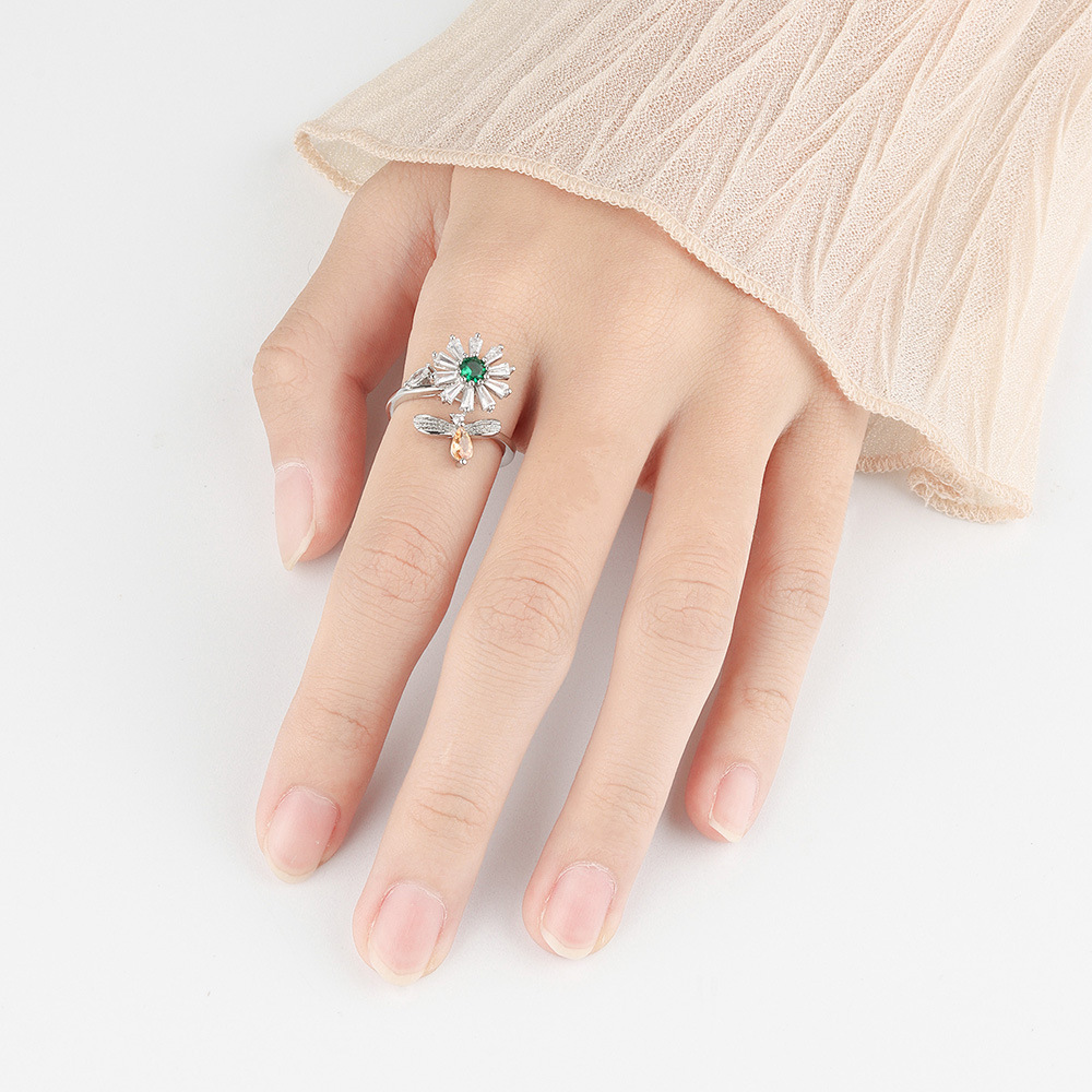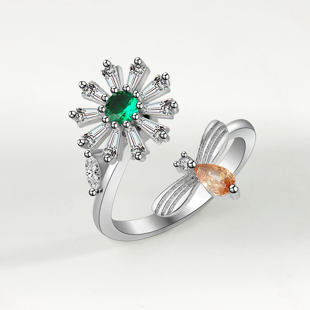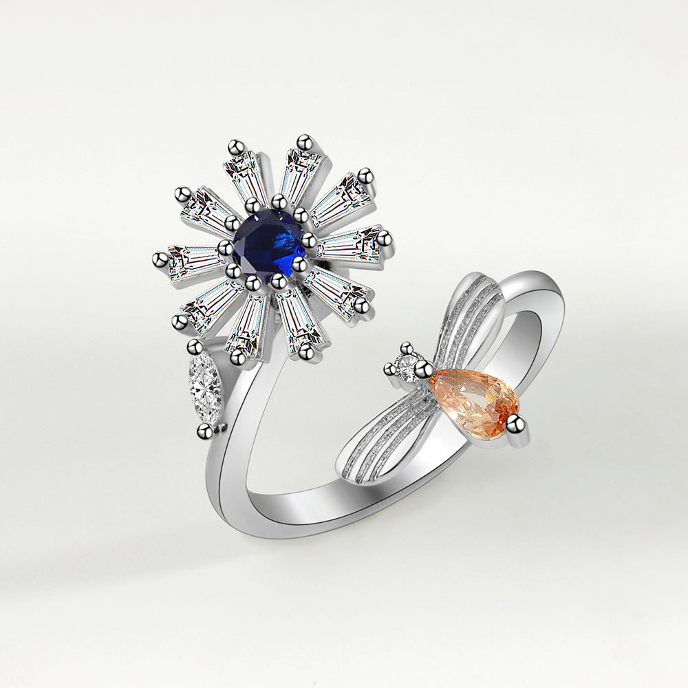 S925銀緩解焦慮壓力蜜蜂采蜜旋轉戒指