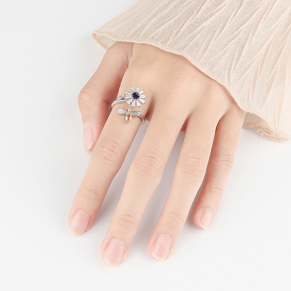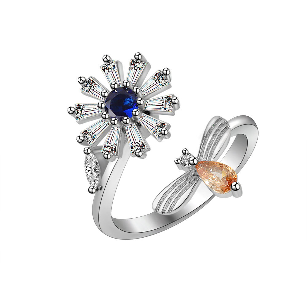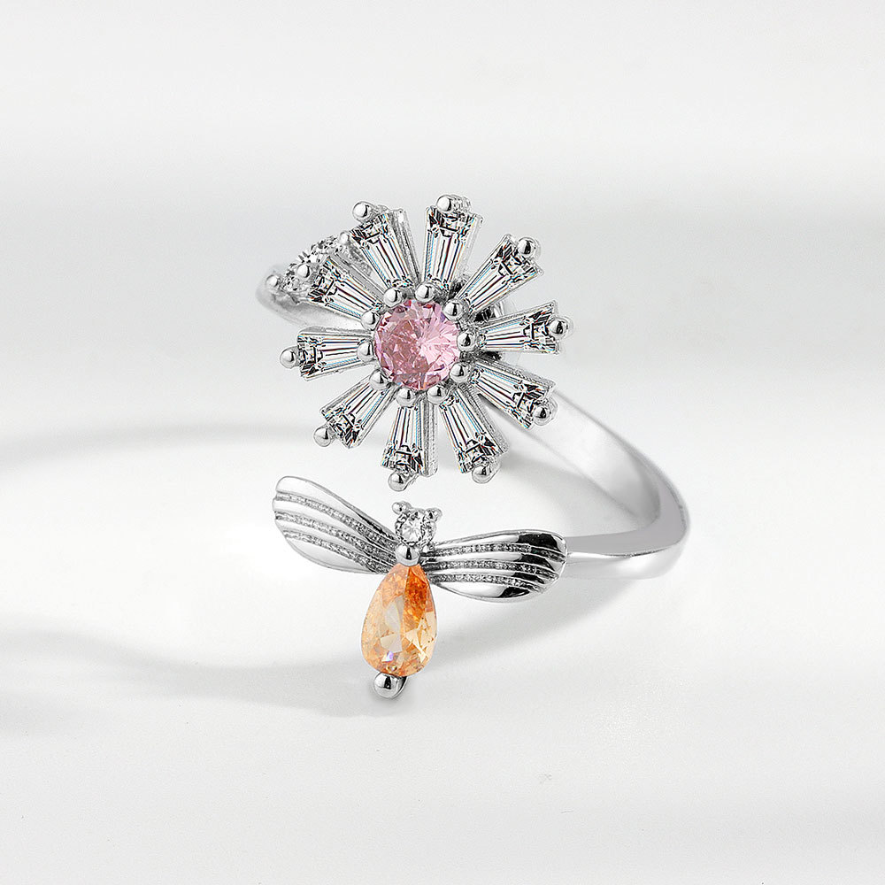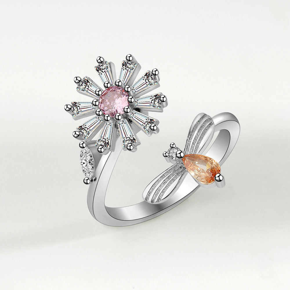 S925銀緩解焦慮壓力蜜蜂采蜜旋轉戒指