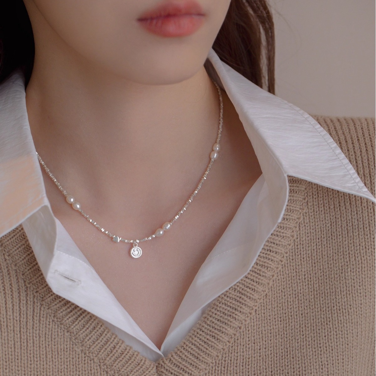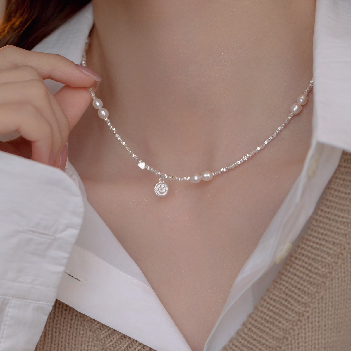 s925純銀天然淡水珍珠碎銀子愛心笑臉項鏈